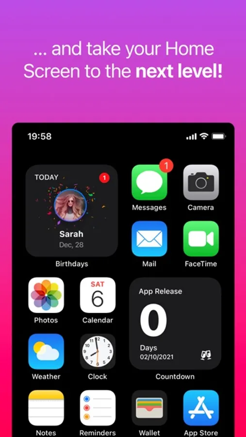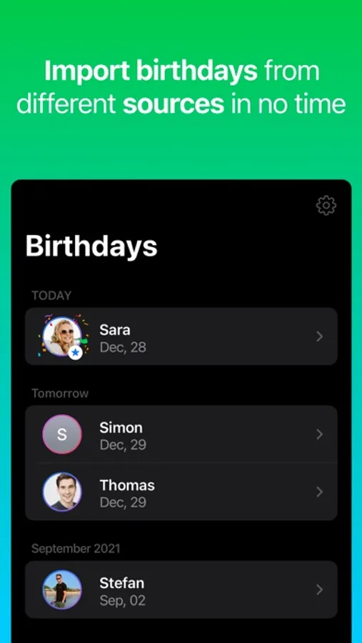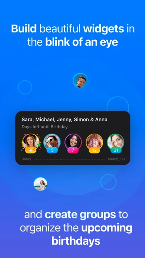 Keep track of all upcoming birthdays. - Directly from your Home Screen. Import birthdays directly from your contacts, create them manually or have them generated automatically from a CSV file. As easy as pie!