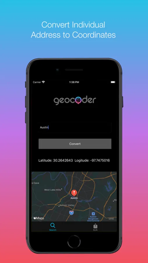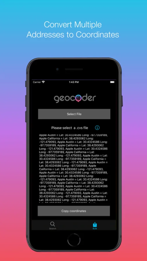 Geocoder converts your individual or multiple addresses to coordinates. Upload a .csv address file to use multiple convert feature.