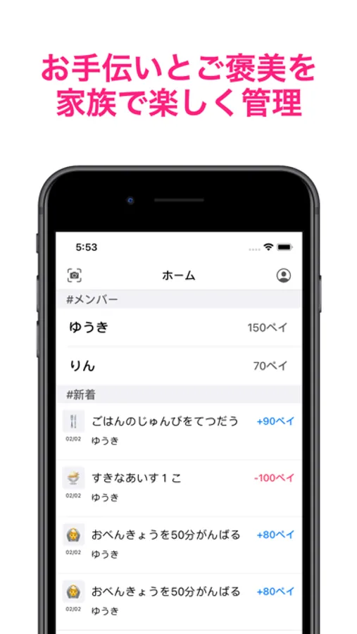 ペイの収支やお手伝い、ご褒美やお小遣いをいつもらった等簡単に知ることができます
