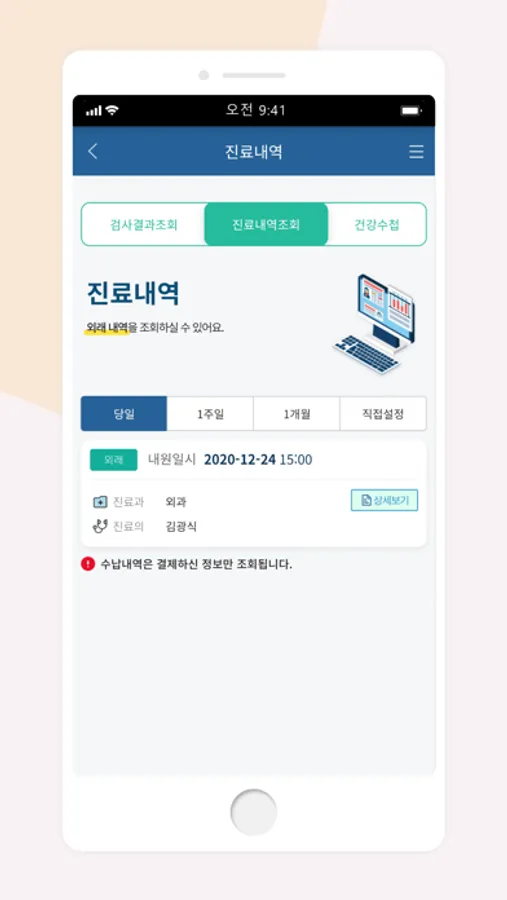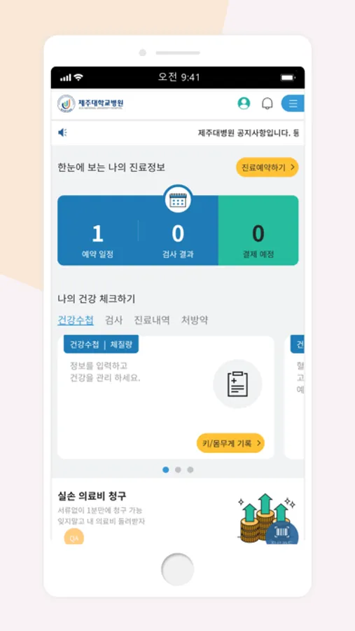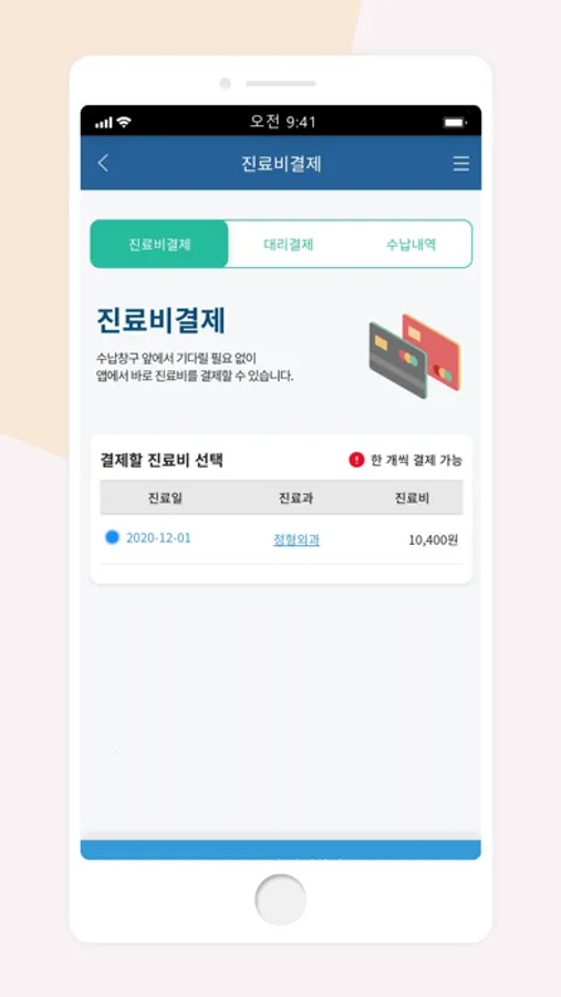 진료비 수납을 모바일에서 편리하게 결제 할 수 있습니다.