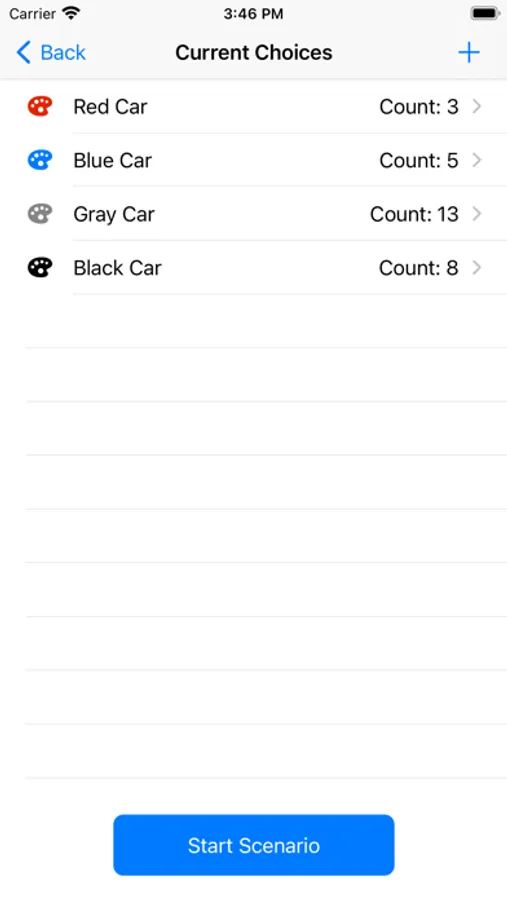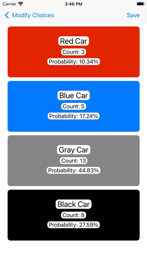 Probability Calc provides an easy and intuitive way to discover the probability of things happening around you. It works by allowing you to input any number of potential choices for things that could happen in a given 'Scenario' and makes it as easy as clicking a button to mark down that one of the choices has occurred. Given just a little bit of time recording the events, you can quickly get an idea of the odds of a certain outcome happening.