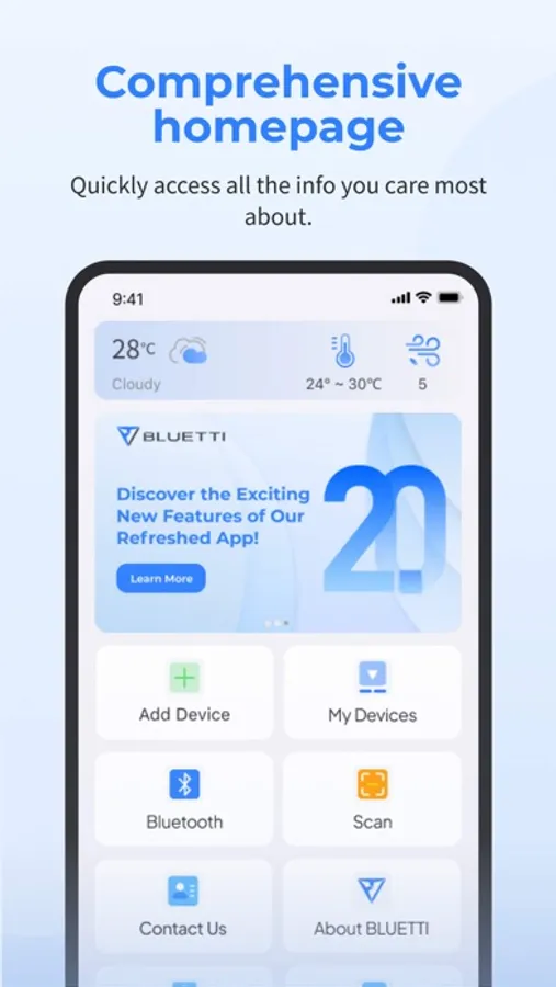 The BLUETTI App allows you to manage your home energy storage systems (ESSs) from anywhere, anytime. Monitor your energy usage, solar power data, and battery status, and even control charging and discharging, all in a matter of clicks.to your home energy storage system anytime, anywhere. With BLUETTI app, you can easily monitor every vital metric like energy consumption, solar power data, battery status, charge/discharge management, charge/discharge scheduling, etc. Take control of your home energy as needed.