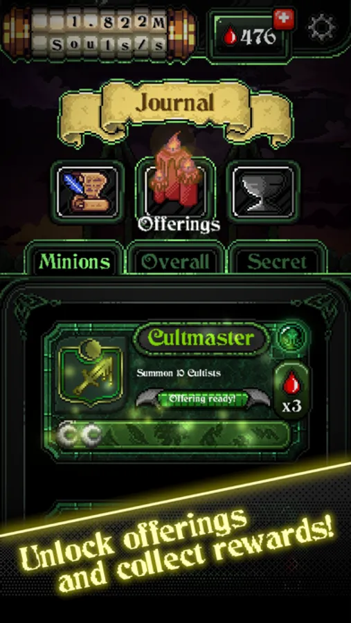 On your altar, there are two magical objects: the skull of a sinner and a goblet of blood. The skull is the key to your minions and the goblet of blood the key to the various powers you can have. The powers include those such as the unique Soulflame torches that help your soul collection (keep them alight by tapping!), some that empower your minions, or some that even unlock new stages of madness. Be careful, manage your level of delirium, lest you go insane!
