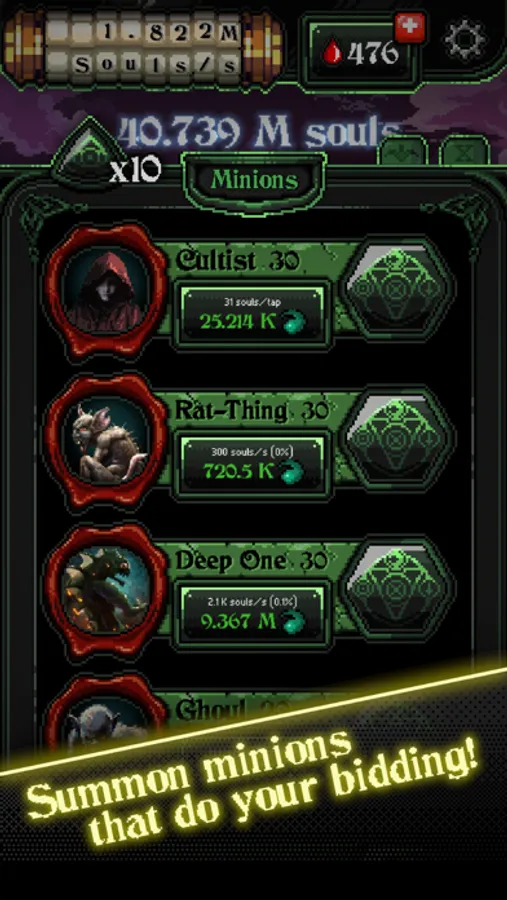 MoM is an indie clicker idle tapping game that comes with a dark magical vibe. Although it's best suited for fans of dark fantasy and gothic horror such as HP Lovecraft or Stephen King, anyone with a love for idle tapping or idle tycoon clicker games can enjoy this game. The gameplay features an eerie atmosphere, a temple with the forgotten old god Cthulhu's mysterious statue, with its back to the roaring ocean under a gloomy sunset. You have to tap on the statue to signify your allegiance to Cthulhu and collect souls. Collect enough souls and different abilities and spells will unlock, which will allow you to enhance your ability to gain even more souls and the precious Ether with which you will gain the favour of the Outer Gods, becoming ever more powerful. Unleash minions such as cultists and ghouls which will help you collect souls more quickly. You can enhance their abilities in exchange of souls and unlock more powerful minions as you move forward within the game.