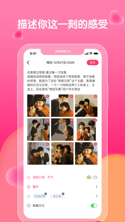 使用心情天气、定位标签,轻松记录每一天,让你与ta的时光有迹可循