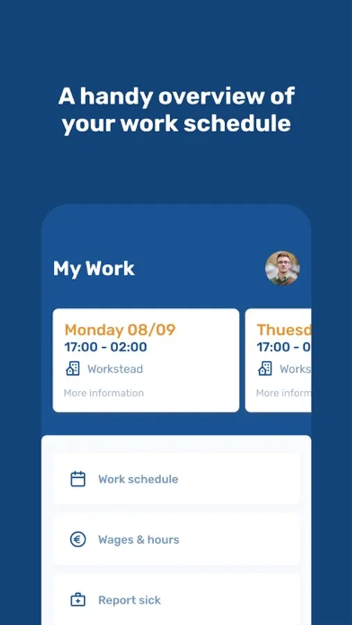 Everything you need to know for work in one place! The app gives you easy access to your work schedule and hours worked. Furthermore, you’ll get a notification when your pay slip in your own language is available. In addition, you can make requests for holidays, work clothing and declarations.