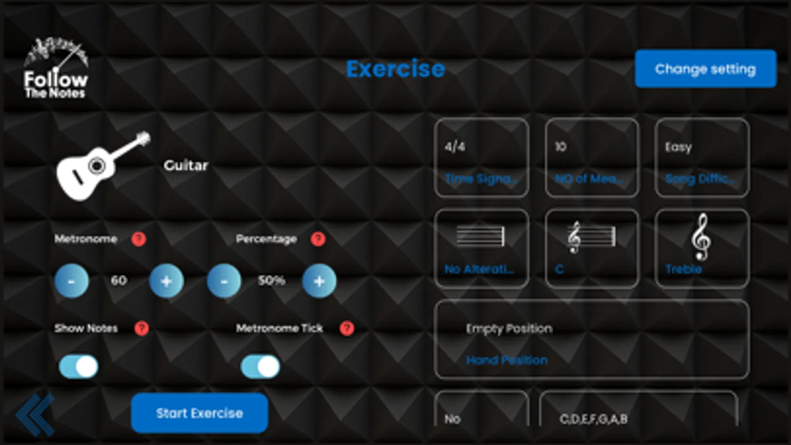 ◦ Tune of your instrument: Before to start, go in the tuning section. You can tune your guitar and 4-5-6 strings bass guitar