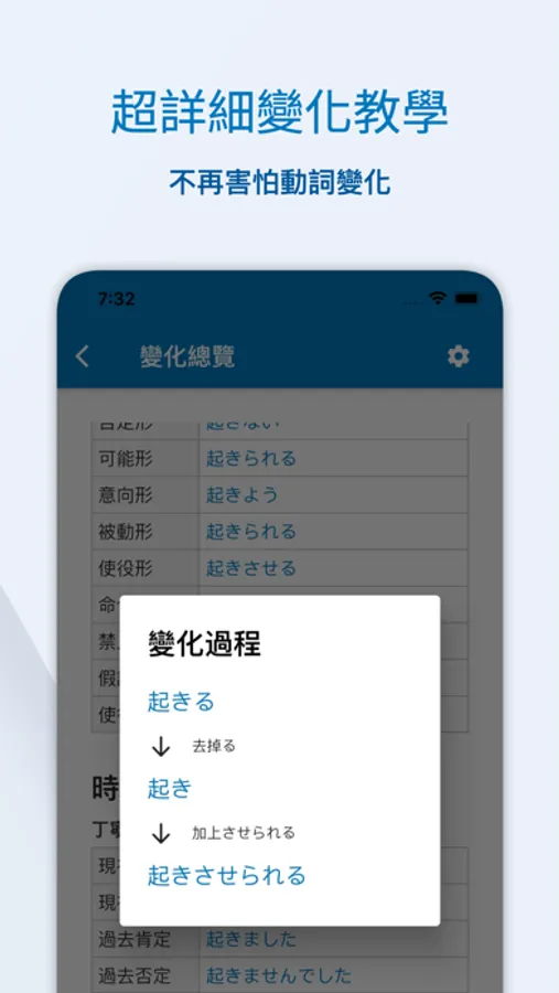 - 進階學習模式,涵蓋十二種動詞變化,常用文法與聽力測驗