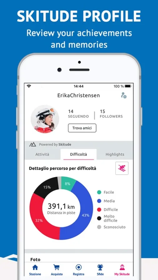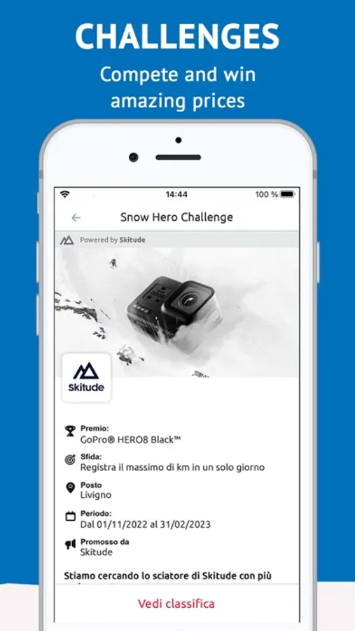 The App offers a range of features designed to optimize your experience before, during and after your trip. It’s very simple, plan your getaway and get real time updates on slope conditions. Set up your Skitude profile and track your activities on the slopes to get detailed stats about all your activities. And that’s not all, take part in challenges competing with the whole community, to be in with a chance of winning incredible prizes.