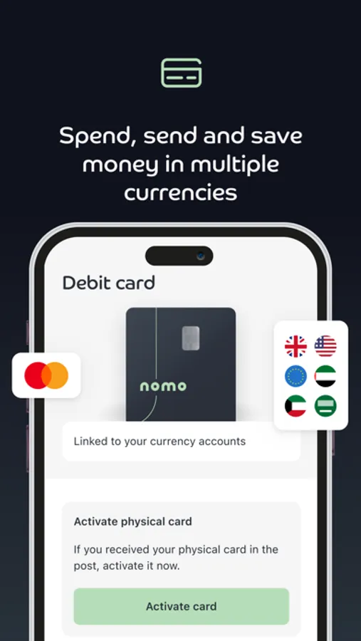 Make purchases with your GBP physical or virtual debit card anywhere in the world and avoid international spending charges when using your card in the UK. Pay quickly and safely in-store, online and in apps using your Nomo debit card with Apple Pay.