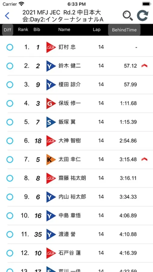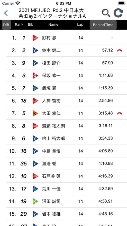 順位変動のある選手を上下の矢印で表示。