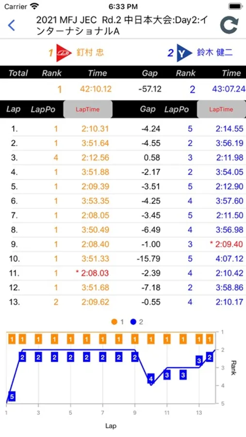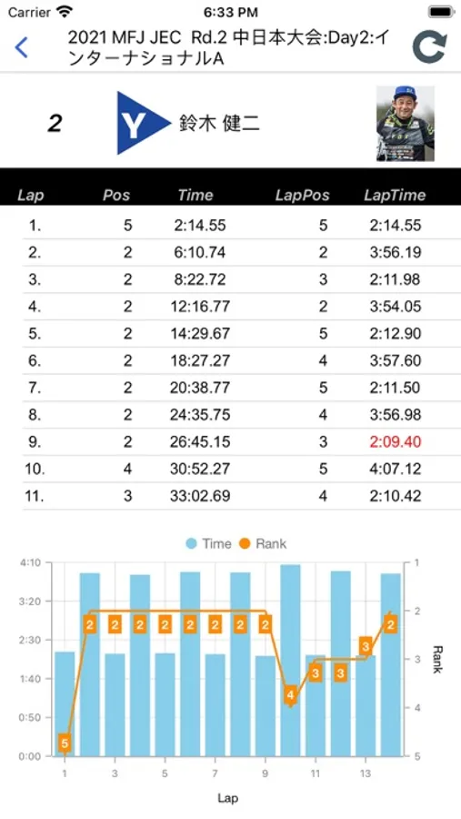 選手詳細では個人のラップタイムと順位変動を確認可能。