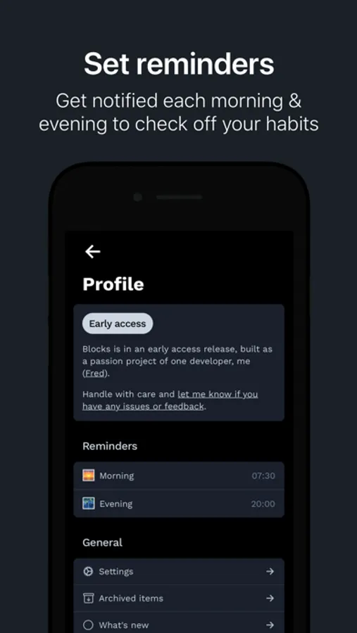 Habits are all about progress and consistency. That’s why with Blocks, you can quickly see how your week, month & year are going at a glance. Build habits with a clean, simple design.