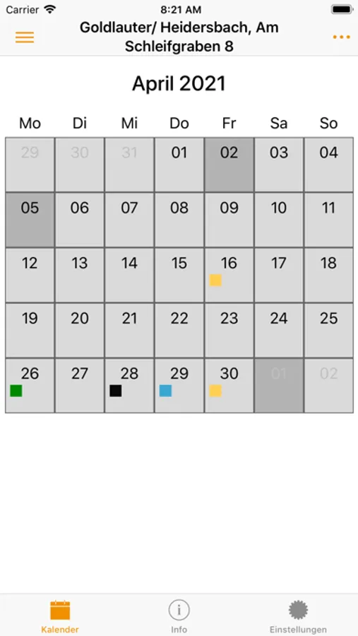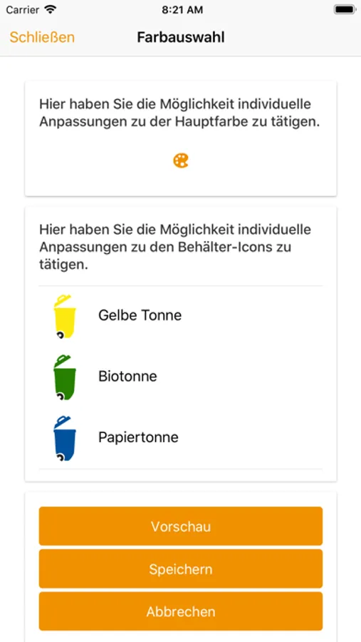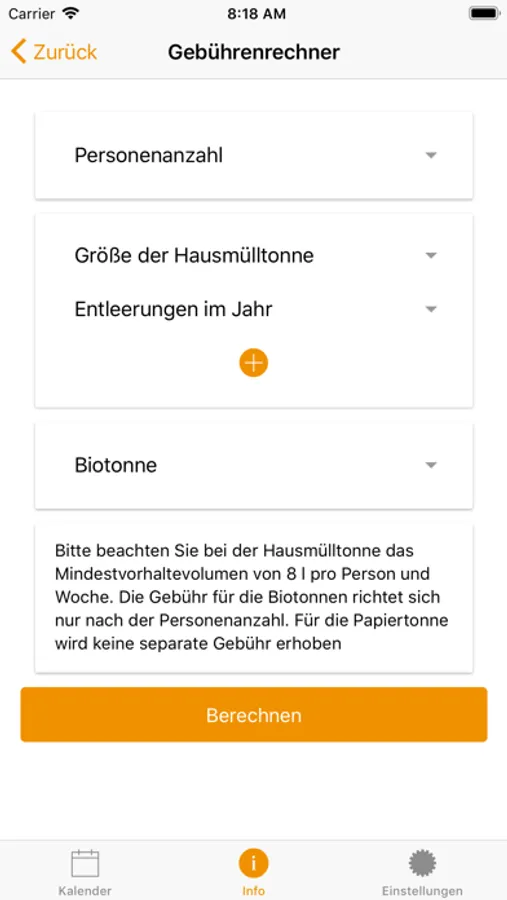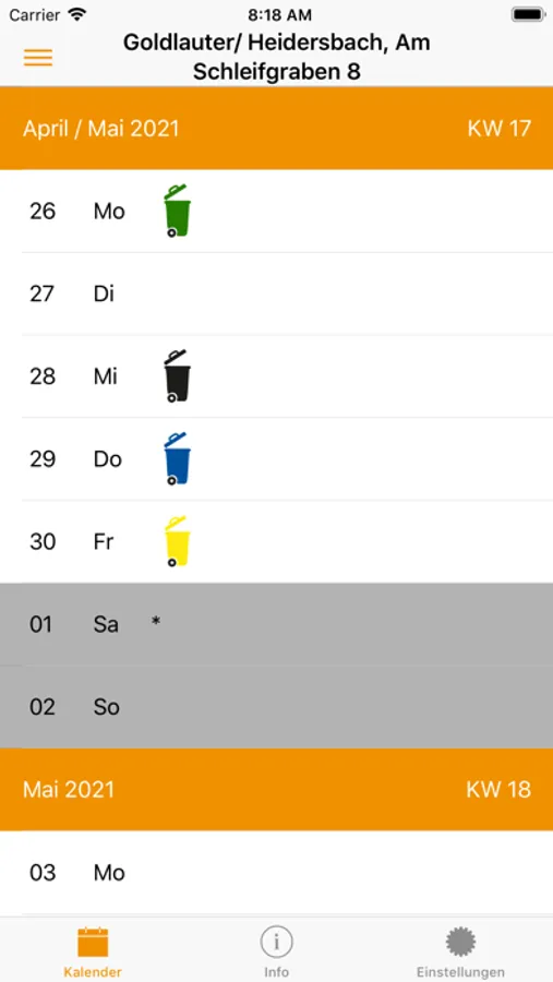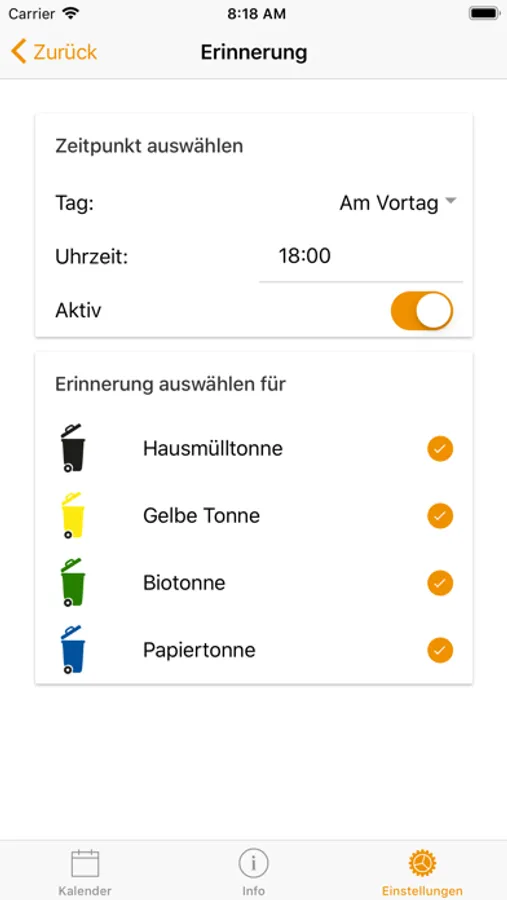 - Auswahl der Abfallarten für eine übersichtliche Kalenderdarstellung