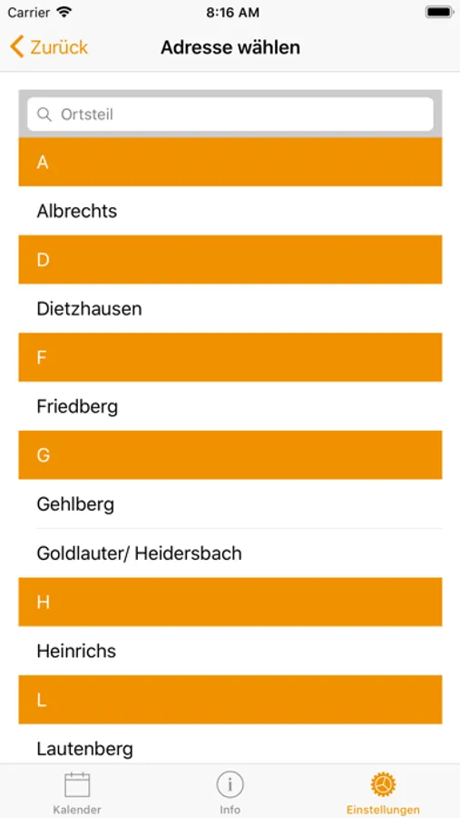 Die Auswahl Ihres Wohnortes erfolgt in wenigen Schritten. Eine Vorschlagsliste unterstützt Sie bei der richtigen Auswahl der Ortsdaten. Durch eine übersichtliche Kalenderdarstellung in Verbindung mit einer einfach einzurichtenden Erinnerungsfunktion verpassen Sie nie wieder einen Abfuhrtermin.