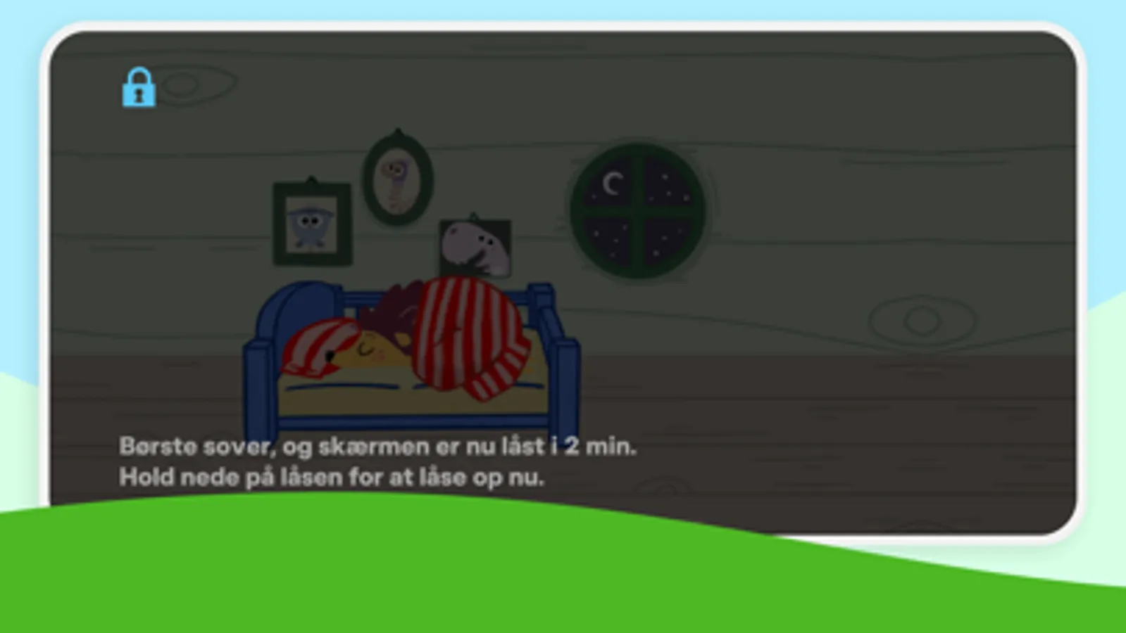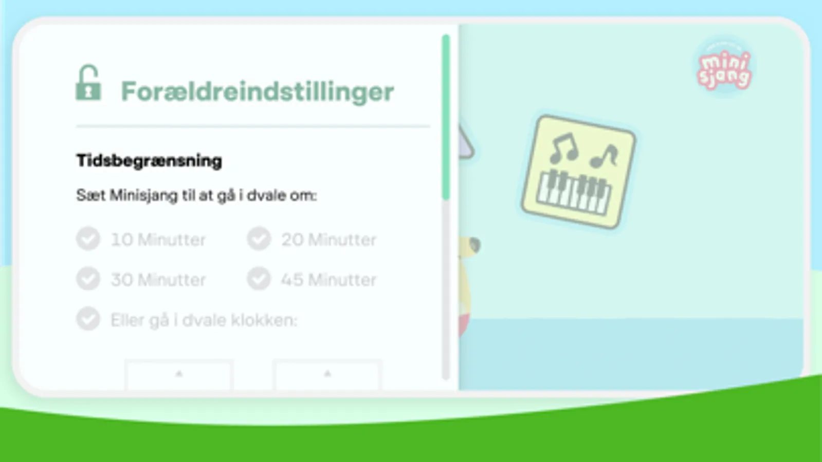 I det afskærmede forældreområde kan du sætte Minisjang-appen til at gå i dvale på det tidspunkt, du ønsker. Når appen går i dvale, toner skærmen ned og Børste bliver træt og skal lægges i seng for at sove. På den måde kan du som forældre sætte en passende skærmtid for dit barn.