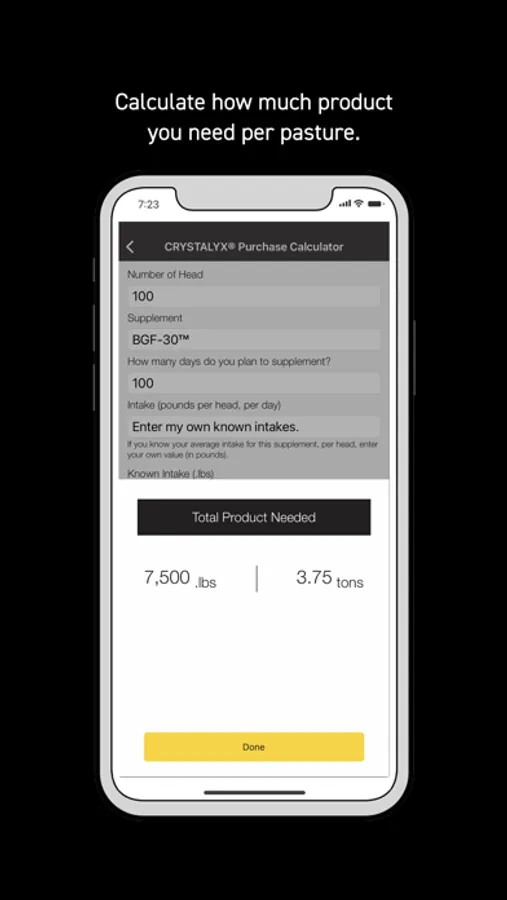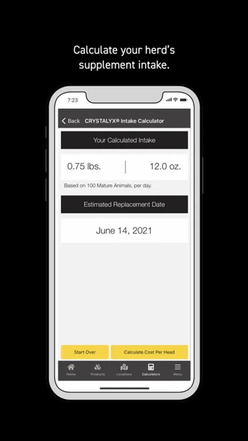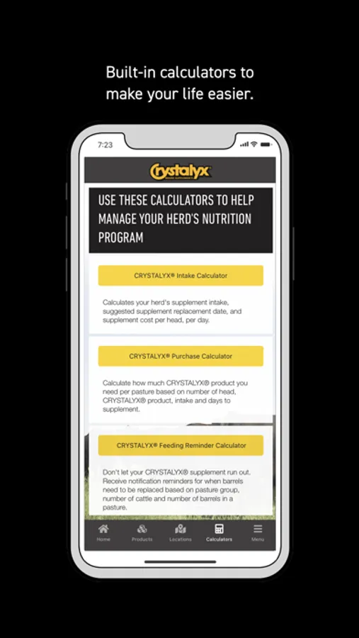 Utilize the many more features of the app for your convenience! Use the built-in calculators to help manage your herd's nutrition program. Choose from the CRYSTALYX Intake Calculator, Purchase Calculator and the Feeding Reminder Calculator — we're here to make your life easier!