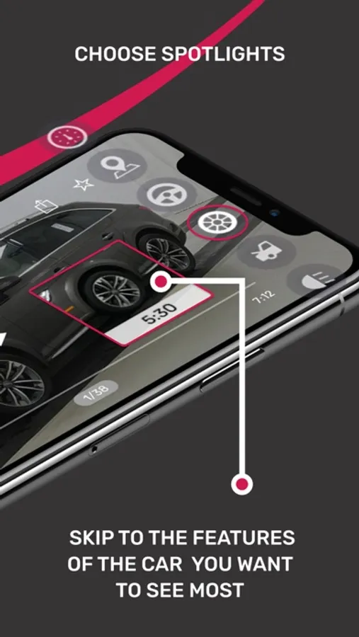 Vehicle Spotlight icons directly on the video to let you skip to the features you want to see most! (Including trunk, navigation, odometer, wheel, steering wheel, headlights and more)