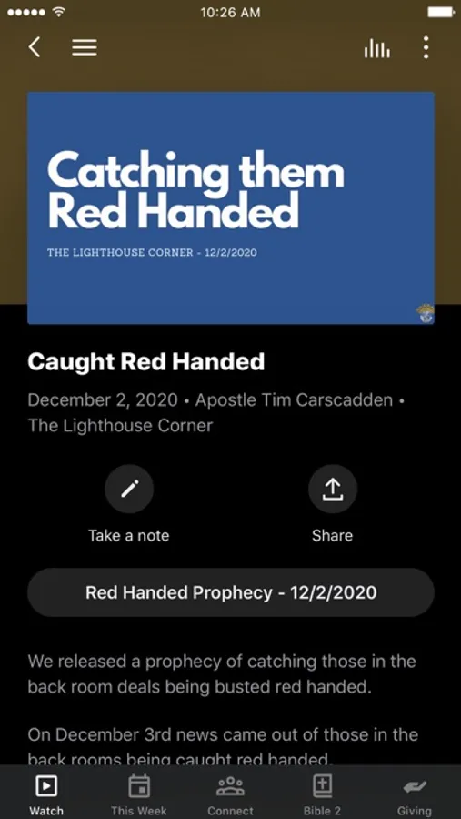 This app will help you stay connected with the day-to-day life of our church. With this app you can: watch or listen to past messages; stay up to date with push notifications; share your favorite messages via Twitter, Facebook, or email; and download messages for offline listening.