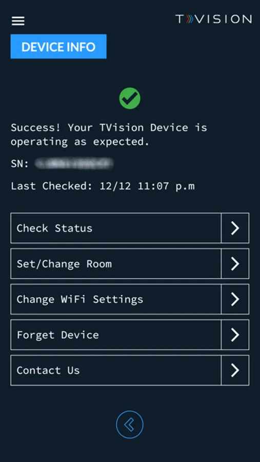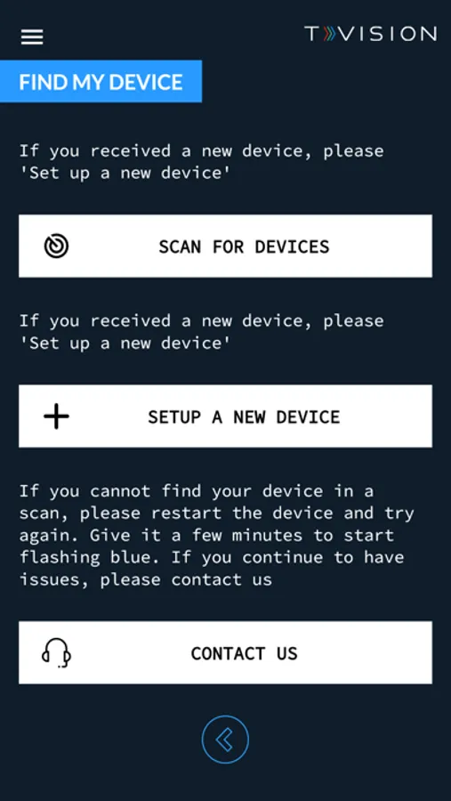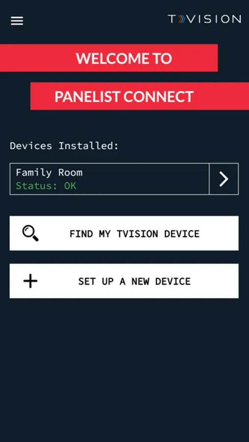 The TVision Panelist Connect app allows you to set up and manage TVision Devices. The app allows TVision Devices to be connected to your home WiFi network and also shows you the current status of the device.