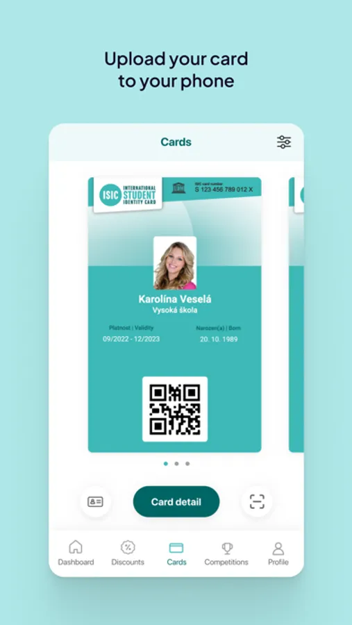 By signing into the app, you will get a digital card that you can use to claim discounts on transportation and with our benefit partners, both in the Czech Republic and abroad. Thanks to the app, you will never miss out on renewing your card, the app will notify you when your current card is near expiry. For now, it is not possible to use your digital card in schools and school systems yet due to technical reasons.