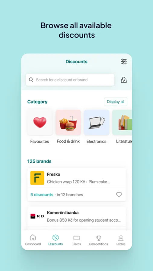 Thanks to the app, you can have discounts at your fingertips. Filter discounts by location, type, or quickly go to your favorites, which you can easily save in one click. You will never miss out on any special or limited offers again.