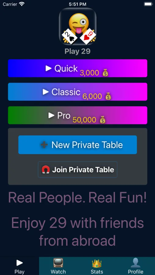 * Private Tables (Play 29 with friends no matter where they are located). Share 4 digit code to invite friends.