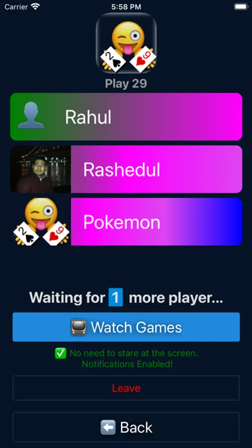 29 Card Game from Play 29 will send you notifications when your game starts. No need to stare at the screen waiting for players.