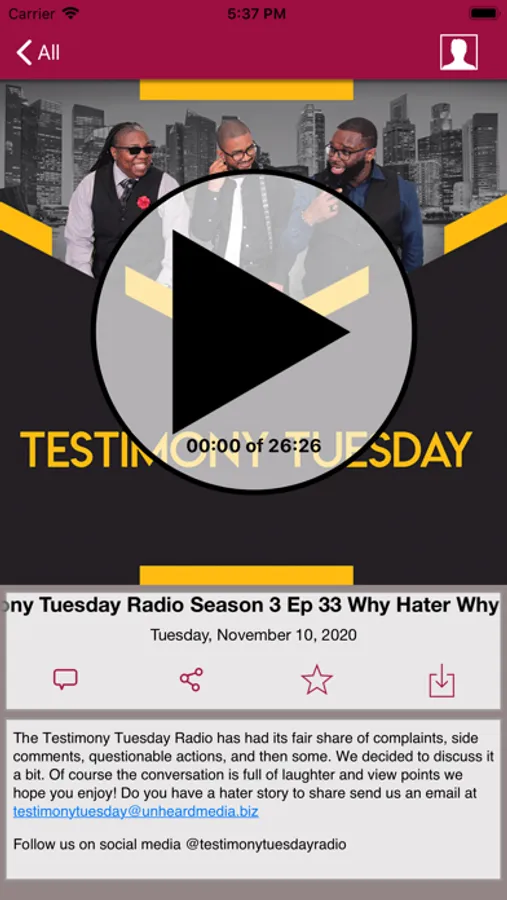 With this app you are always connected to the latest episodes and the show. Quickly star episodes and save them to a list so you can easily enjoy them over and over! This app has a Car mode too! Rotate your phone to display larger playback controls. It is the best and most convenient way to access Testimony Tuesday Radio.