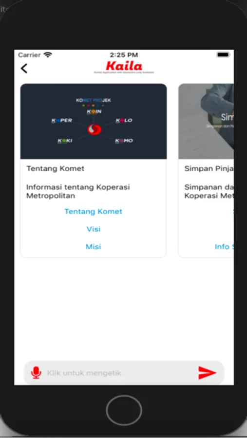 KAILA adalah sebuah platform AI (Artificial Intelligent) berbasis percakapan yang hadir untuk membantu Anggota Koperasi Metropolitan dalam menyediakan informasi terkait Simpanan dan Pinjaman anggota.