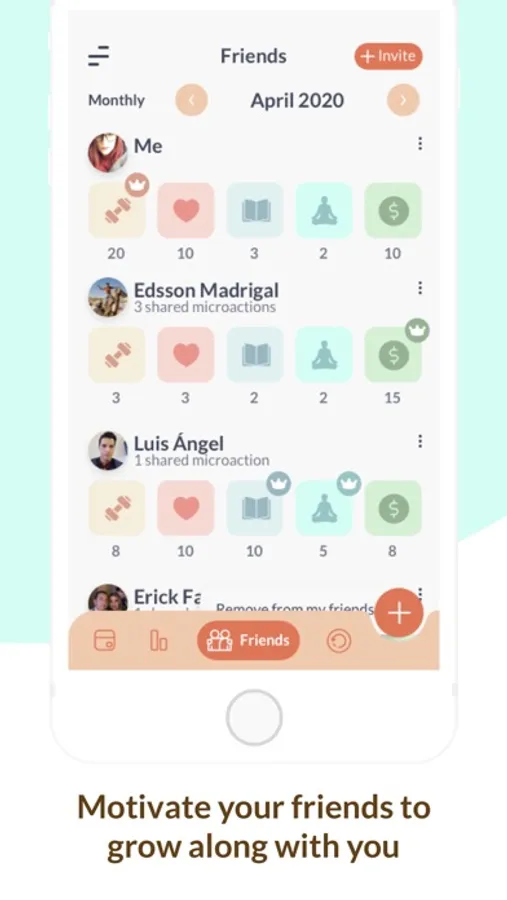 Motivate your friends to grow together with you, watch their progress, share micro-actions, see who is the best in each area. Doing it together is easier and more fun!