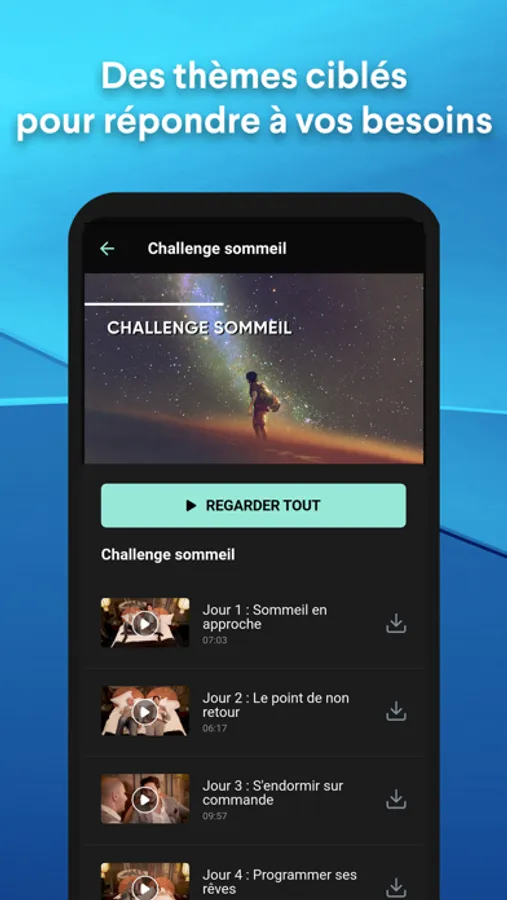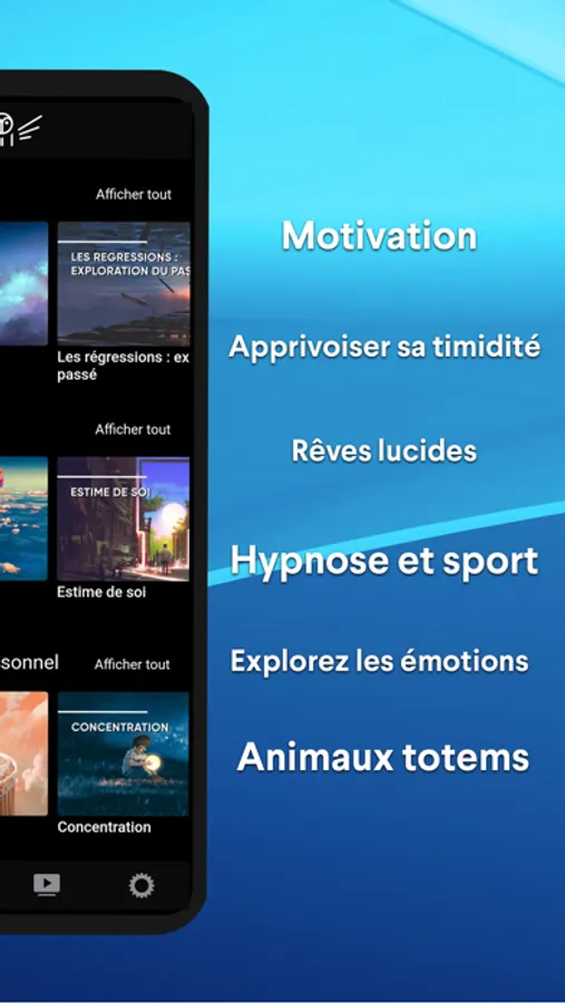 Une fois les bases maîtrisées, choisissez parmi des dizaines de thèmes ceux qui vous intéressent : sommeil, concentration, état de flow,animal totem, timidité... et bien d’autres !