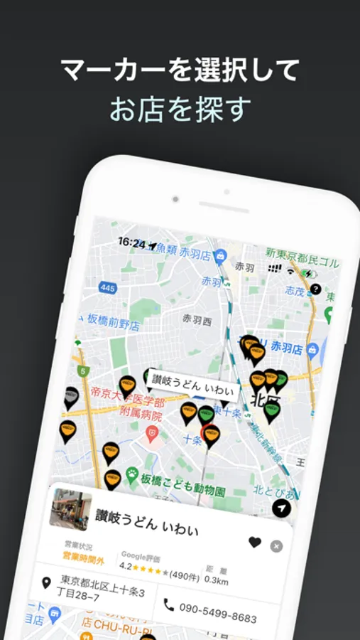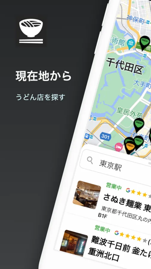 現在地や指定した場所の近くのうどん店を探して調べることができるアプリです。