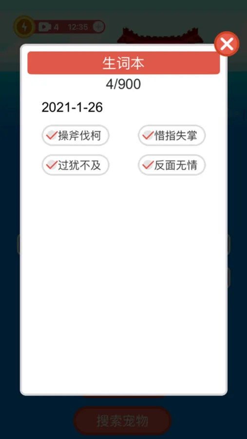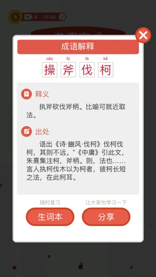每关结束可以查看每个成语的读音,解释和出处,并可以加入生词本作为以后复习。