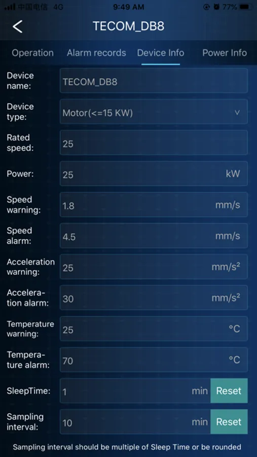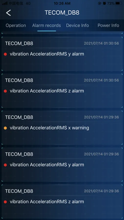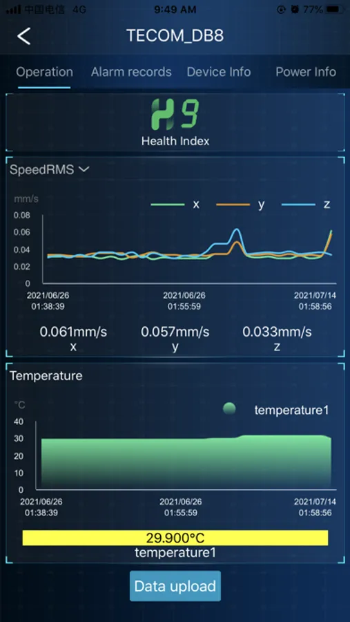 This APP works with Tecom VB-800 Smart Wireless Vibration Temperature Sensor which is installed on rotating machine. User can read the real-time operation information (three-axis RMS vibration of velocity & acceleration, the FFT of velocity & acceleration, raw data, single point temperature), Health Index and Maintenance Schedule Suggestion of the machine through this APP. The information can also be uploaded to the remote management platform to perform functions such as storage, trend comparison, diagnostic analysis and report output. It provides predictive maintenance and be prepared for the worst.