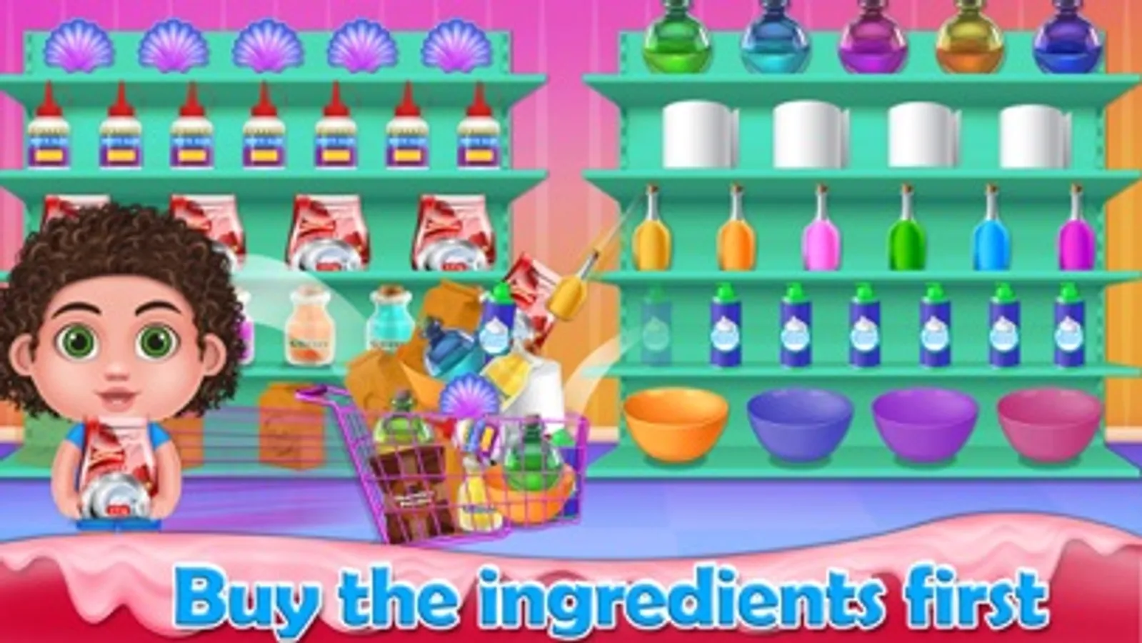 Each slime simulator process start with shopping the relative sliming like bowl, powders, floor, glitter, glue, shampoo, conditioner, foam cream, tissue paper, chocolate power, mermaid etc..