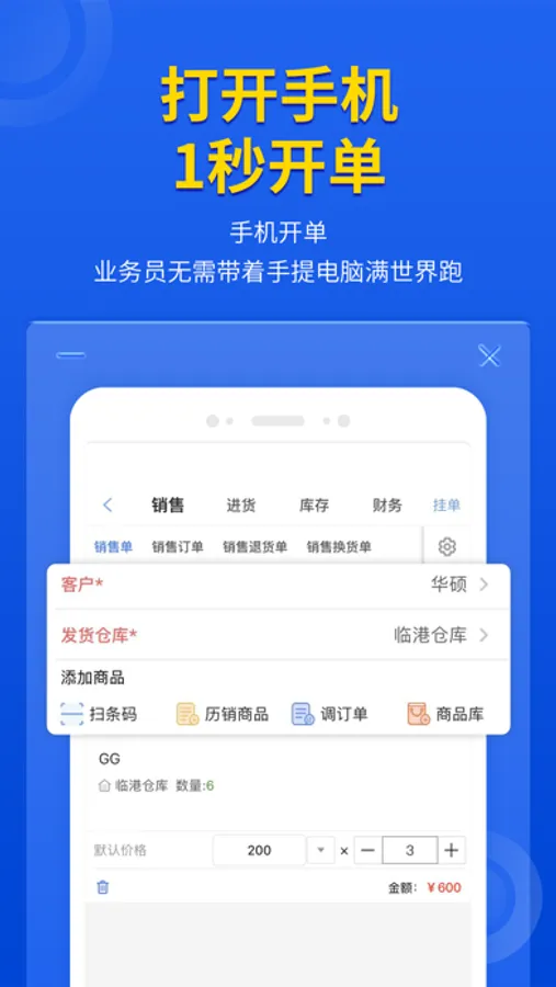 - 包含销售、进货、库存、财务常用单据,让您外出办公无需繁琐操作,打开手机即可快速开单
