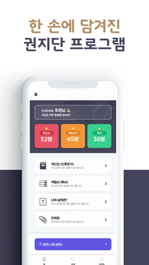 리딩 권지단은 학습자 주도력 향상을 목표로 하는 권지단 프로그램에 맞추어 학습자가 스스로 주도하여 학습하고 진단할 수 있는 환경을 마련해주기 위해 제작되었습니다. 시간과 장소에 구애받지 않고 학습자는 질문, 독해, 표현으로 이루어진 권지단 학습 프로그램을 제공 받을 수 있습니다.