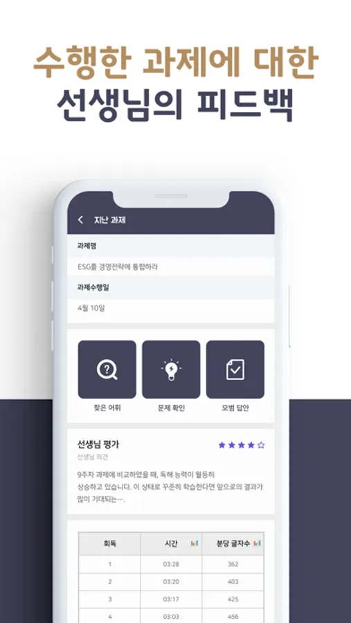 학습결과는 학생뿐만 아니라 담당 선생님이 확인하고 학생에게 필요한 정보를 피드백 합니다. 담당 선생님은 학습 데이터를 기반으로 학생들의 상황에 맞추어 다음 학습단원과 분량을 결정하여 학생의 자기주도학습을 돕습니다.