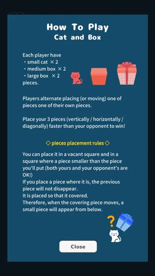 Place your 3 pieces (vertically / horizontally / diagonally) faster than your opponent to win!