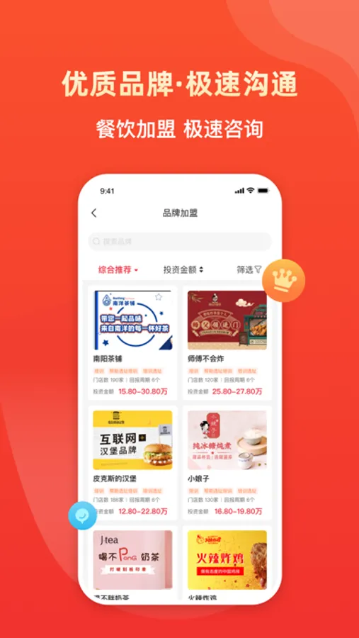 汇聚海量优质餐饮品牌,入驻审核标准严格,为餐饮从业者及餐饮创业者提供品牌筹备、品牌升级、品牌扩展,覆盖餐饮发展整个生命周期的品牌服务,助力餐饮品牌快速发展。