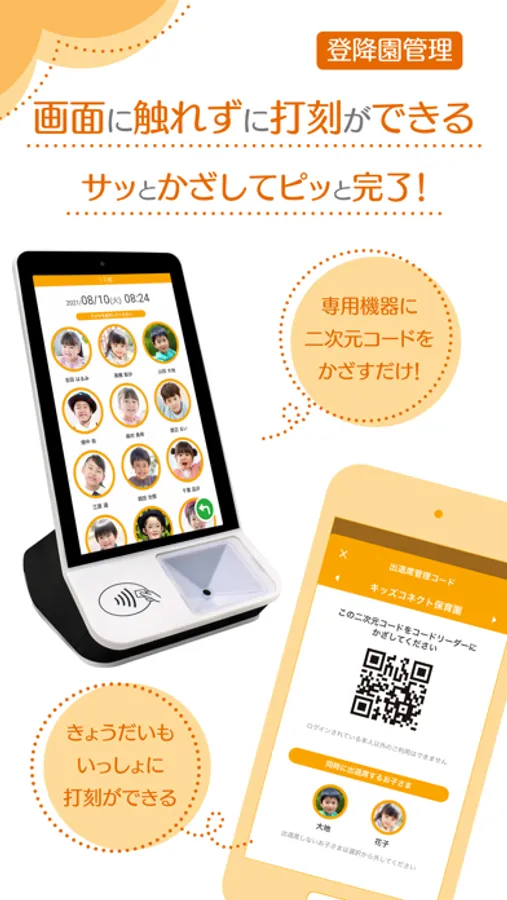 ・二次元コードをかざすだけで簡単に出退席(登降園)の打刻ができます。