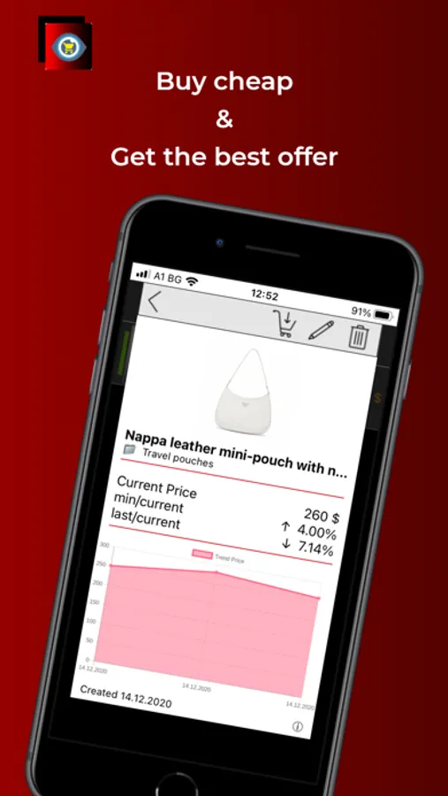 - Product overview (analysis of the price change in graphical form and percentage ratio to the lowest and last selling price, name, price, photo, category, date of creation, description)