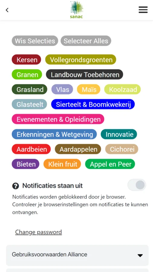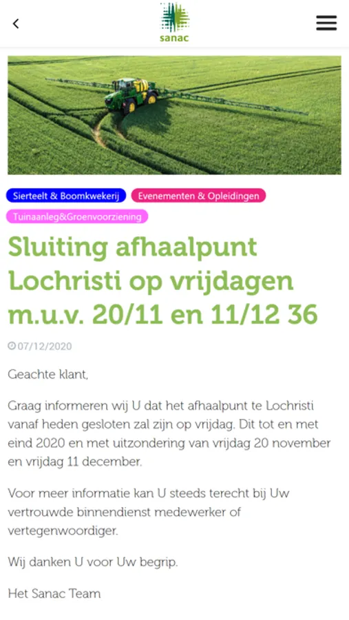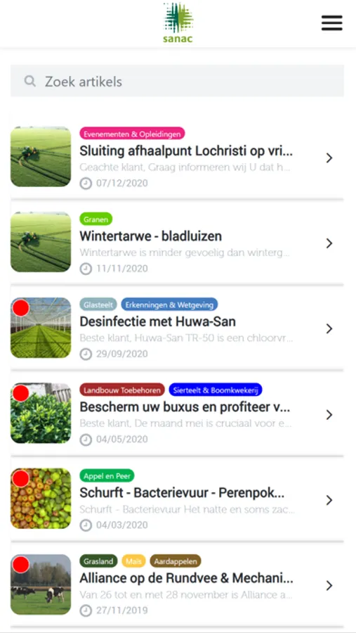 Heb steeds de laatste teeltinformatie op zak! Ontvang het laatste nieuws over zaden, gewasbescherming en bemesting voor teelten die voor u belangrijk zijn. Een onmisbare tool om samen u Sanac adviseur het meeste uit u bedrijf te halen.