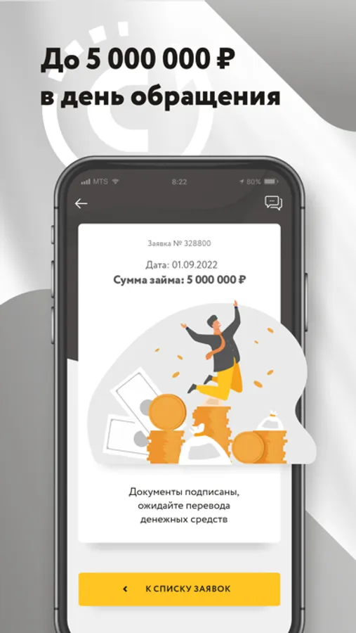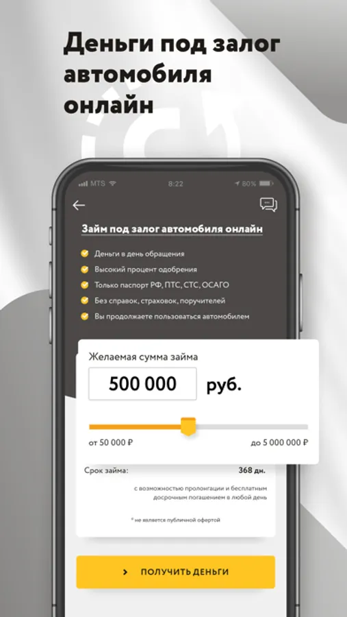 Через мобильное приложение CASHMOTOR вы можете легко оформить срочный займ под залог автомобиля до 5 млн рублей или заключить договор вклада в МФК (инвестиции) онлайн без визита в офис.