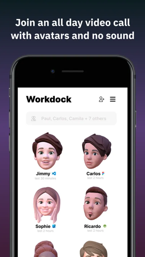 People are more than their squares in a video call. We’re on a mission to make remote work better than being in the same room. Workdock connects you and your team in an all-day video call with avatars and no-sound. You can see your team and friends whilst you work, and start an unscheduled conversation. No links, no “hey, do you have a sec” messages.