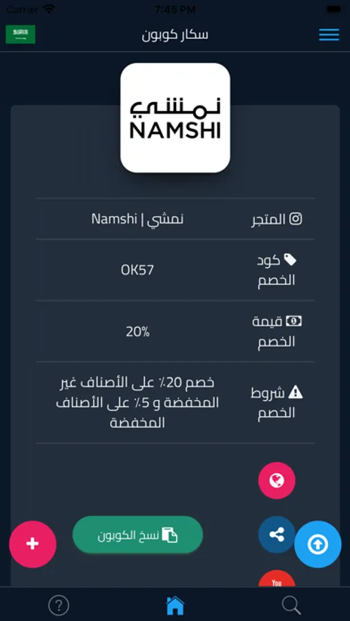 سكار كوبون عباره عن منصة لعرض احدث الكوبونات لدى المتاجر وتطبيقات التوصيل المحلية والعالمية ويمكنكم طلب اضافه الكوبونات وعرضها في التطبيق ومن مزايا التطبيق: