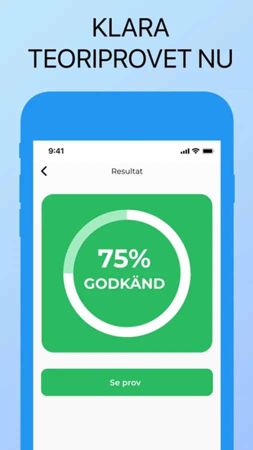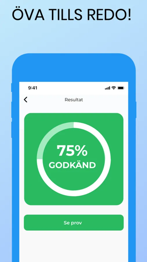 Varje prov består av 65 frågor, inklusive facit och förklaring. Appen visar även statistik från dina tidigare prover, så att du har full kontroll över vad du behöver öva mer på och när du är redo för det riktiga provet.