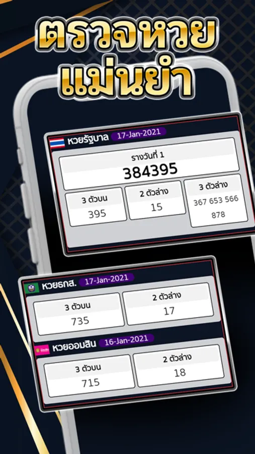 * ตรวจรางวัลย้อนหลังได้เพียงใส่ตัวเลข 6หลัง และเลือกงวดที่ต้องการตรวจ