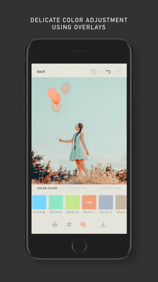You can create your own look by combining the overlays provided. Overlays include color filter, color tint and sunset glows.